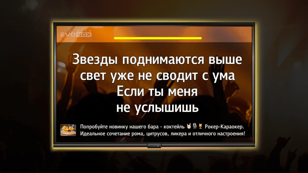 При помощи EVOBOX Club вы можете демонстрировать на гостевом экране рекламное изображение и текст в формате бегущей строки, логотип заведения, а также слайд-шоу из фотографий, проморолики и анонсы мероприятий.